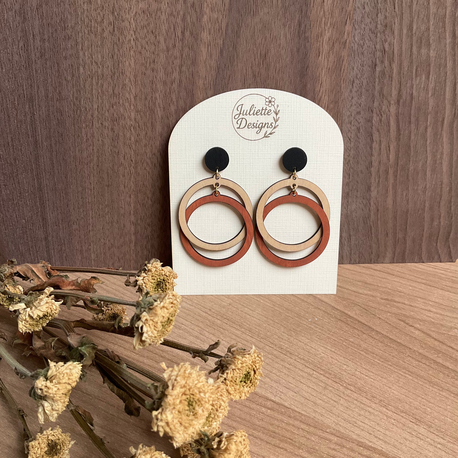 Met zorg gemaakt uit hout en afgewerkt met roestvrijstalen oorstekers in goudkleur, brengen deze statement oorbellen een subtiele, moderne touch aan elke outfit.