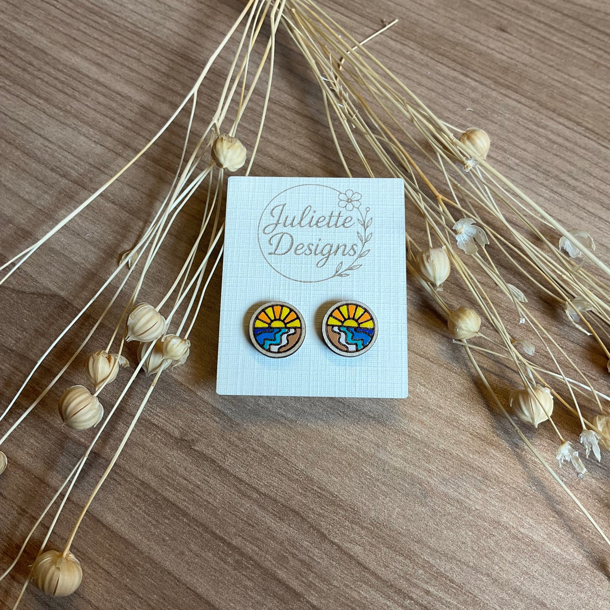 Laat je betoveren door deze handgemaakte houten oorstekers met kleurrijke landschappen in miniatuur. Elk paar is uniek en straalt de rust, warmte of magie van de natuur uit, van zonsondergang tot sterrennacht.