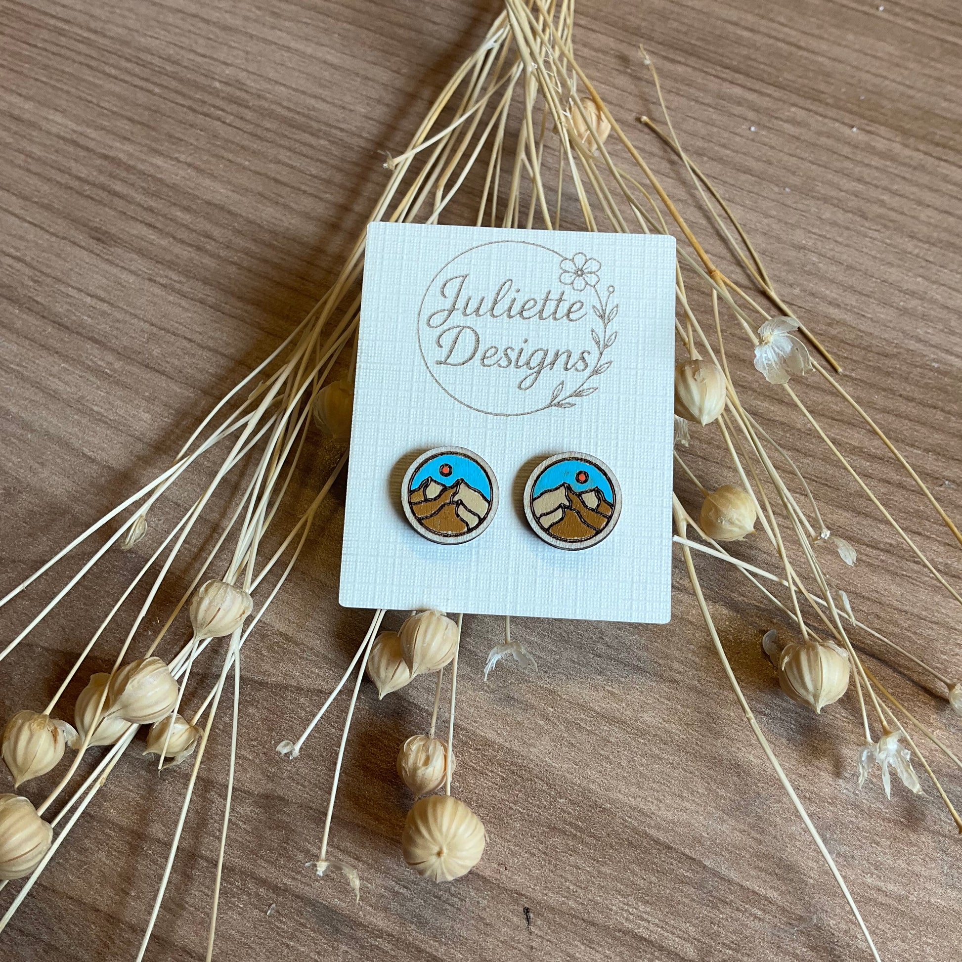 Laat je betoveren door deze handgemaakte houten oorstekers met kleurrijke landschappen in miniatuur. Elk paar is uniek en straalt de rust, warmte of magie van de natuur uit, van zonsondergang tot sterrennacht.