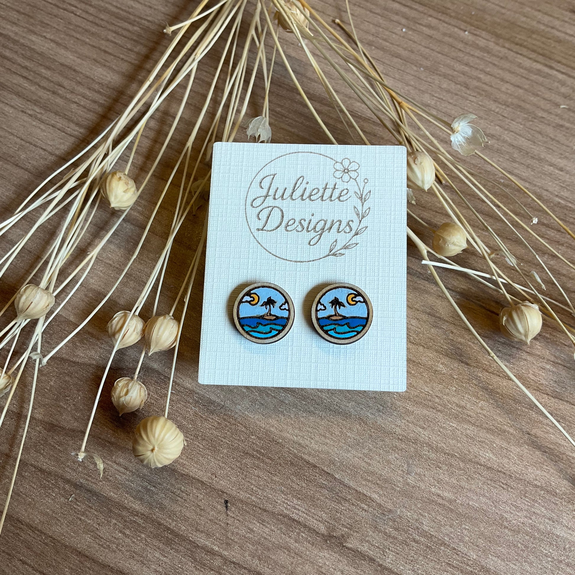 Laat je betoveren door deze handgemaakte houten oorstekers met kleurrijke landschappen in miniatuur. Elk paar is uniek en straalt de rust, warmte of magie van de natuur uit, van zonsondergang tot sterrennacht.