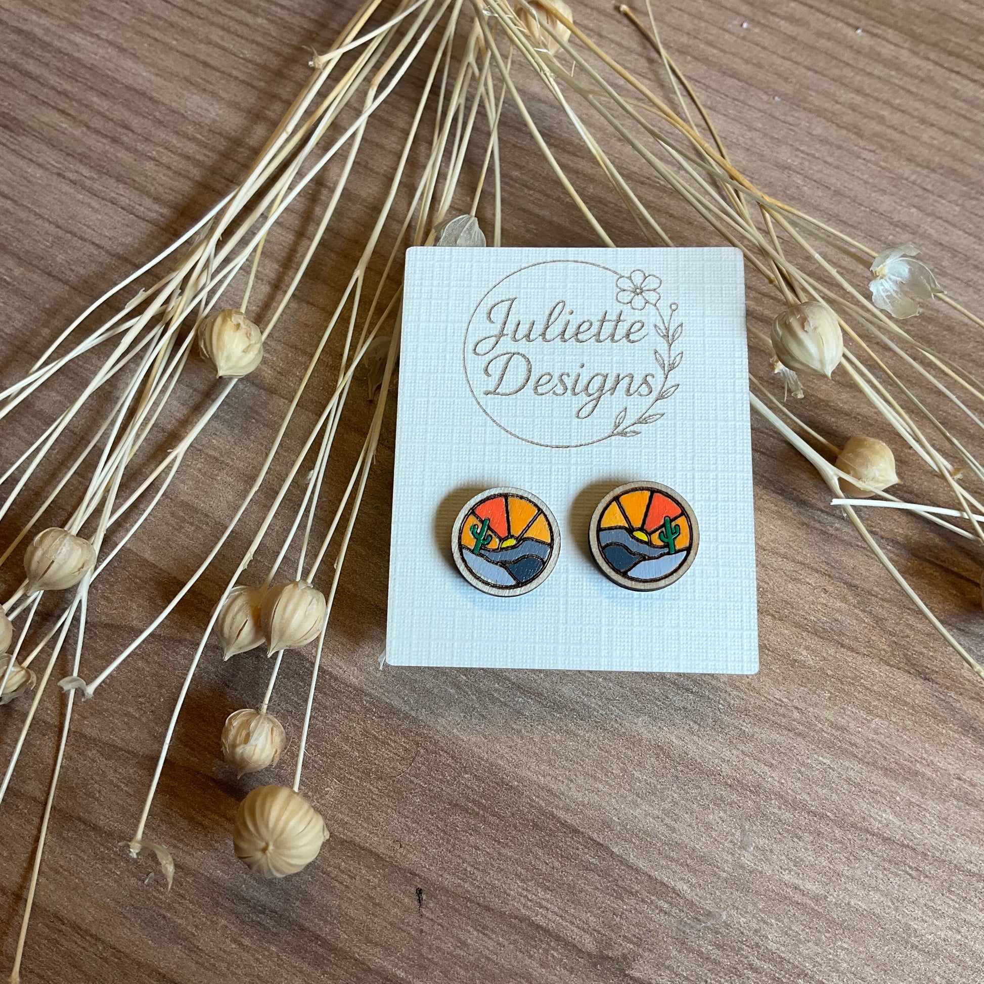 Laat je betoveren door deze handgemaakte houten oorstekers met kleurrijke landschappen in miniatuur. Elk paar is uniek en straalt de rust, warmte of magie van de natuur uit, van zonsondergang tot sterrennacht.