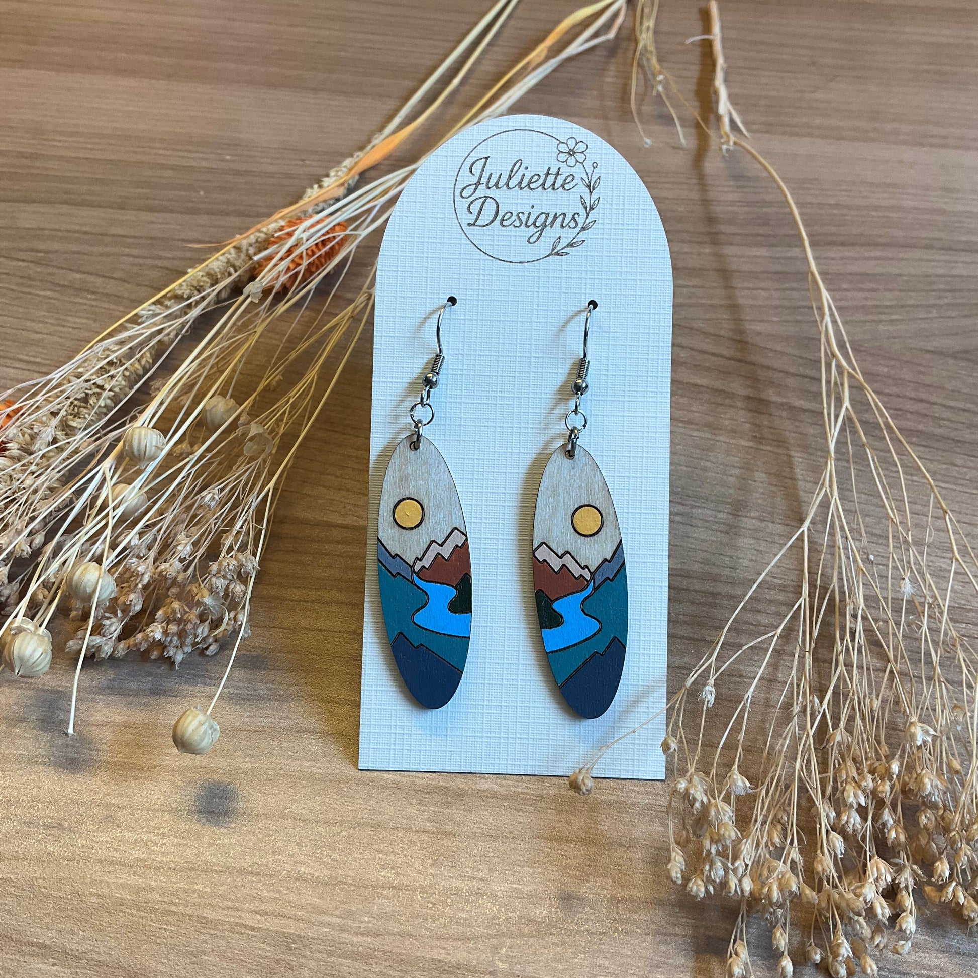 Laat je betoveren door deze handgemaakte houten oorhangers met kleurrijke landschappen in miniatuur. Elk paar is uniek en straalt de rust, warmte of magie van de natuur uit, van zonsondergang tot sterrennacht.