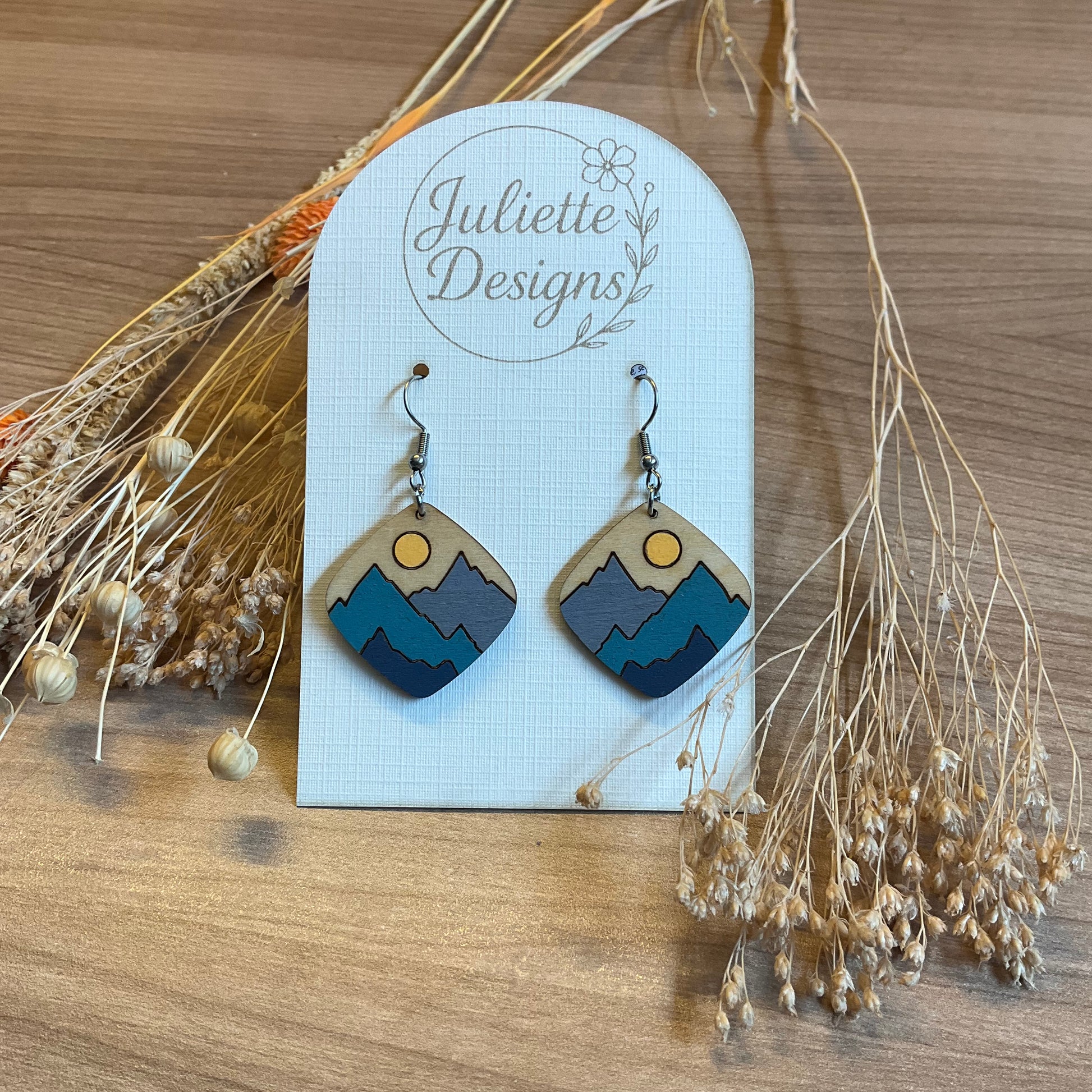 Laat je betoveren door deze handgemaakte houten oorhangers met kleurrijke landschappen in miniatuur. Elk paar is uniek en straalt de rust, warmte of magie van de natuur uit, van zonsondergang tot sterrennacht.