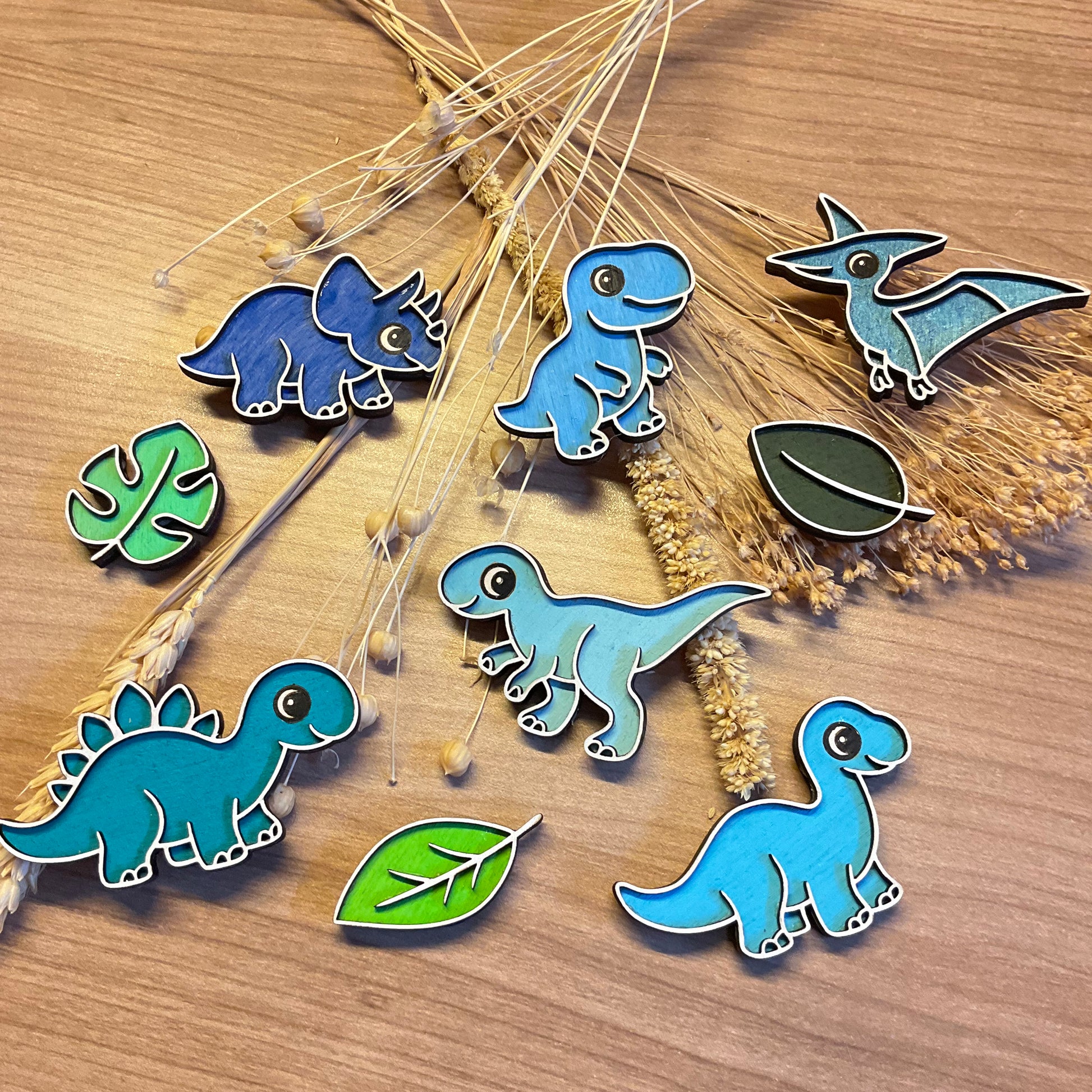 Breng een vrolijke oertijdsfeer in huis met deze schattige dinomagneetjes! De set bestaat uit 6 kleurrijke dino’s en 3 bijpassende blaadjes, ideaal voor op je koelkast, whiteboard of magneetwand.